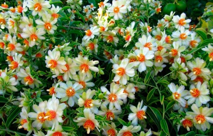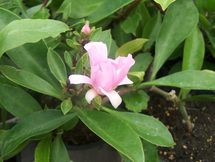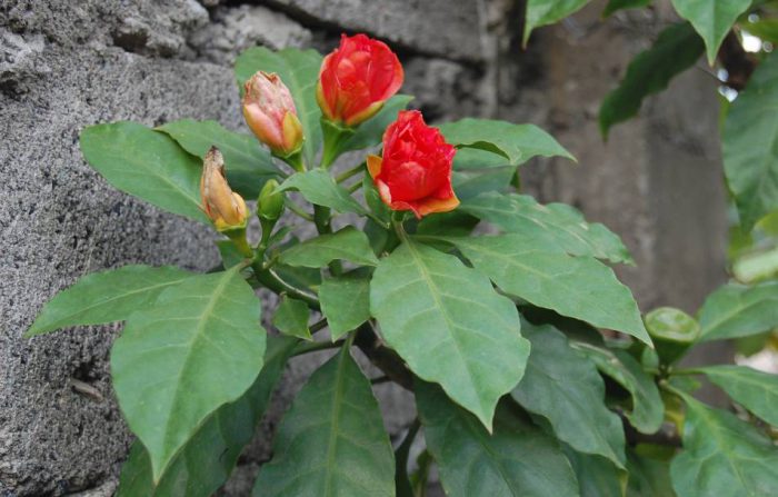 Блискучі шкірясті листочки з настанням зими опадають, але тільки в тому випадку, якщо в приміщенні буде менше 10 градусів. Стебло покрите великою кількістю шипів, довжина яких може бути дорівнює від 2 до 3 сантиметрів. Зібрані в суцвіття квіточки пофарбовані в рожевий колір.