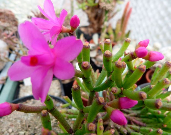 У цієї рослини дугоподібні пагони або прямі, в довжину вони досягають близько 0,3 м. До їх складу входять темно-зелені сегменти циліндричні в перерізі, довжина яких 20-50 мм, причому вони досягають в поперечнику 5 мм. Квіти малинові.