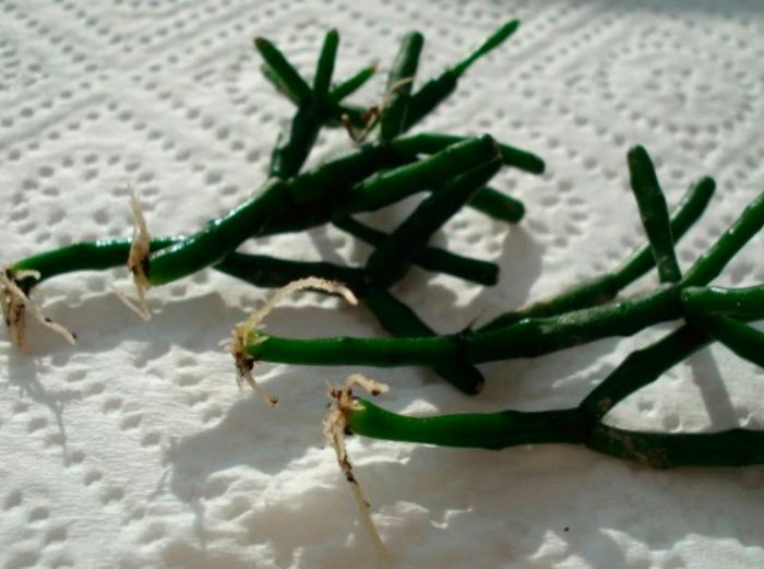 Кімнатну хатіору дуже легко і швидко можна розмножити живцями. Будь обломившийся від стебла членик можна використовувати в якості живця, причому він може дати коріння тут же в горщику поруч з батьківським кущем. Для того щоб розмножити квітка таким чином, коли він відцвіте, від втечі акуратно відкручують 3 або 4 членика. У отриманого черешка треба обробити ранку подрібненим деревним вугіллям і дайте йому підсохнути на відкритому повітрі протягом 3-5 діб. Потім нижню частину відрізка присипають Корневином і висаджують на укорінення у зволожений ґрунт. Полив живців проводять тільки тоді, коли ґрунт повністю просохне, при цьому зволожують її через піддон (нижній полив). Якщо за молодим растеньицем правильно доглядати, то вже на наступний рік він зацвіте.