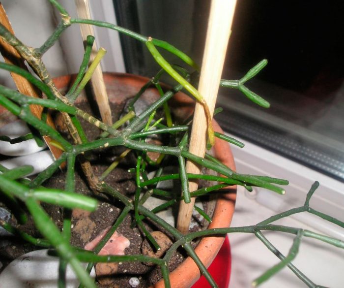 Щоб рослина виглядала охайно і красиво його потрібно кожну весну обрізати. Для цього акуратно пальцями «відкручують» від пагонів всі непотрібні членики.