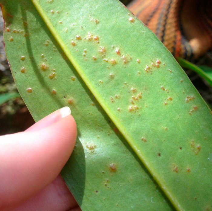 У деяких випадках на листі домашнього непентеса можуть з'явитися плями червоного або бурого відтінку. Це говорить про те, що він вражений грибковою хворобою, розвиток якої провокує висока вологість повітря і ґрунтосуміші. Щоб вилікувати вражений кущ, його обробляють розчином фунгіциду.