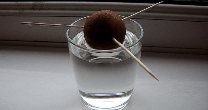 - Кісточку не очищають, а з трьох боків до неї встромляють зубочистки на невелику глибину (близько 3 міліметрів). Потім насіннячко треба розмістити таким чином, щоб тупий кінчик виявився повністю у воді, а при цьому місця, в яких простромлена кісточка, не повинні стикатися з рідиною.