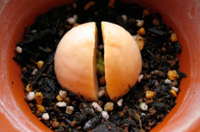 - В грунт садиться неочищена кісточка. Загострений кінчик повинен бути спрямований догори. А кісточка обов'язково при цьому повинна підніматися над поверхню грунту на 1/3 частину. Полив нечастий, достатньо 1 разу на 7 днів.