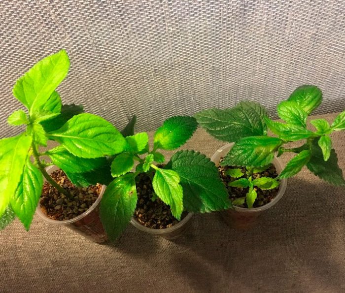 Темні зелені листочки на стеблі розташовуються супротивно і мають зубчасті краї. Знизу листя вздовж прожилок опушена. Трохи потерши листочок, ви зможете відчути пряний і дуже приємний запах, який здатний наповнити всю кімнату.