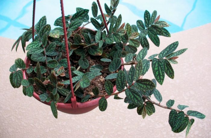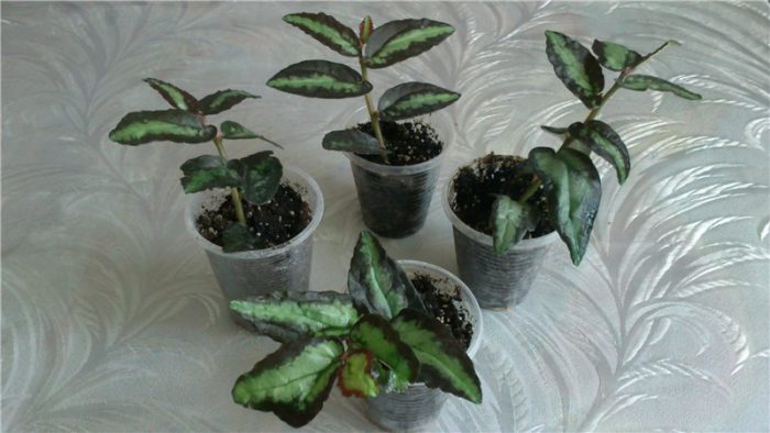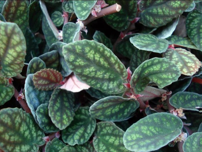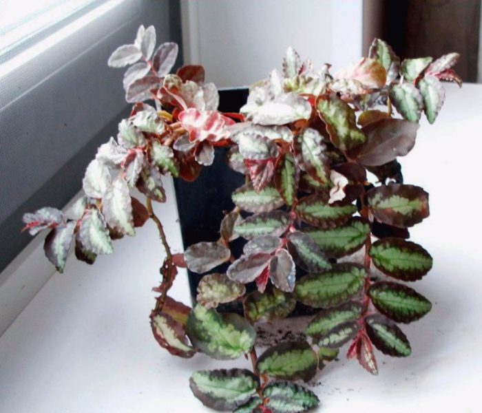 У неї є голі, досить товсті пагони, забарвлені в блідо-бурий колір, а на них очереднорасположенны асиметричні широколанцетні листочки, що мають підстави серцеподібної форми, а також коротенькі живці. Поверхня листя гладка, слабогородчатая, а в довжину вони досягають 4-6 сантиметрів. Мають незвичайне і красиве забарвлення. Прямо по центру проходить досить широка, поздовжня смуга блідого, зелено-сіруватого кольору. А по краю листочки пофарбовані в темний, майже чорний, відливає пурпурним, колір. Виворітна сторона листа зелено-сіра. На повзучих стеблах утворюється корінці в місцях, де вузли торкаються до поверхні грунту, за рахунок цього відбувається досить швидке розростання на всі боки.