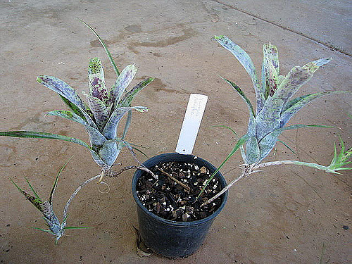 Даний епіфіт є многолетником і у нього кругла щільна листова розетка. Листочки мають языковидную форму і закруглені верхівки з гострими кінчиками, а по краях розташовуються короткі коричневі шипи. Листя пофарбовані в зелено-жовтий колір і мають коричневі смужки неправильної форми, а в підставі вони покриті маленькими лусочками.