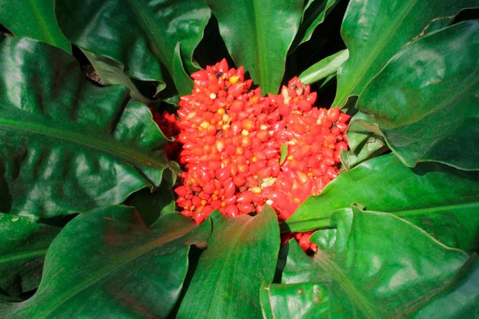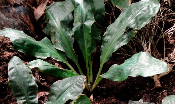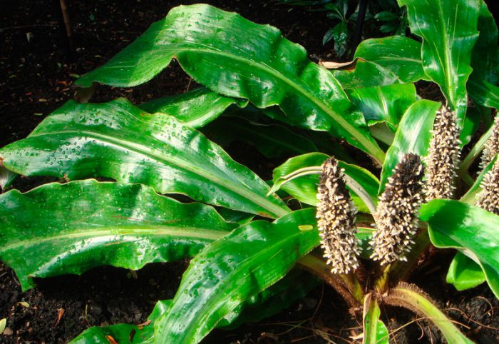 Деякі види не мають стебла зовсім, а у інших він дуже короткий. З часом відбувається формування густої прикореневої розетки, що складається з длінночерешкових, шкірястих листків. Влагалистые, жолобчасті черешки досить товсті. Їх підстави утворюють трубочки, а вже з них починають рости нові листочки. Листки широколанцетні або овально-довгастої форми, що мають загострений кінчик. Дрібненькі актиноморфні квіточки не представляють декоративної цінності. Вони пофарбовані в рожево-білий або чисто білий колір і зібрані в щільне, густе суцвіття у вигляді волоті. Суцвіття кріпляться до товстим цветоносам, які виростають безпосередньо з центру розетки листя. Яскраві соковиті плоди прикрашають рослину. Вони мають конусоподібну форму і пофарбовані в білий, блакитний або червоний відтінок.