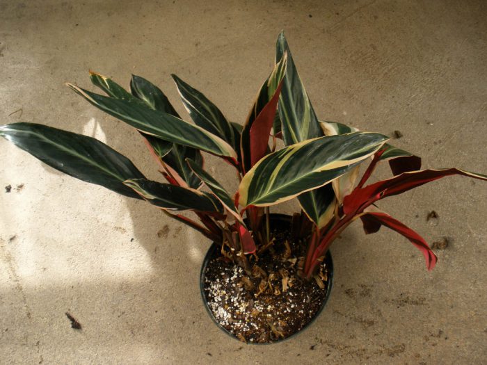 Найбільш популярний вид в домашньому квітникарстві. Ця рослина в природних умовах може досягати у висоту 90 метрів. Різнокольорові листочки розташовуються на досить довгих черешках і мають списоподібну форму. Бархатисті листя, мають довгасту форму, в довжину досягають 40 сантиметрів. Смужки у них кремово-сріблясті або блідо-зелені. Пофарбовані листочки несиметрично, а їх виворітна сторона пурпурного кольору.