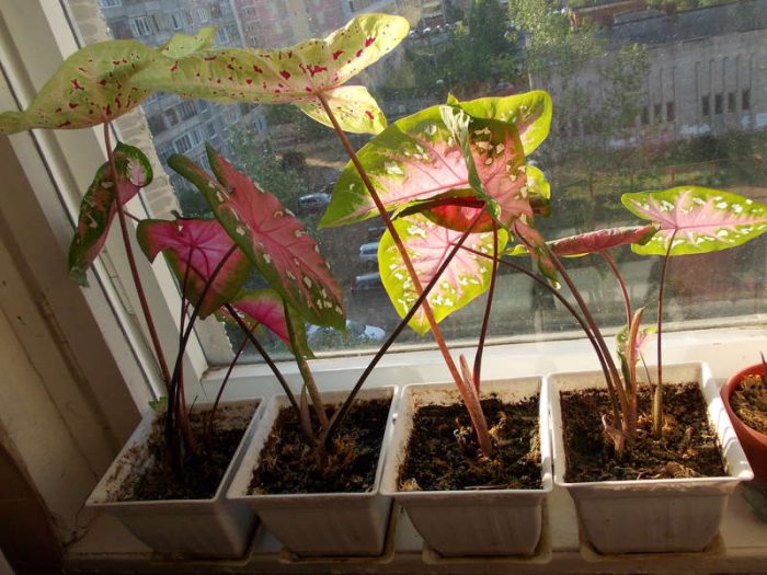Однак не для всіх довгий період спокою ― це неодмінно недолік. Наприклад, такий квітка відмінно підійде для тісних квартир, в яких є лоджія, засклений балкон або простора веранда. Справа в тому, що в зимовий час великим квіткам у квартирі не вистачає місця. Проте в теплу пору року її площа значно збільшується. Каладіум можна на зиму поставити в комору, а з настанням весни він рушить в зростання. Варто при цьому врахувати, що листя ростуть досить швидко.