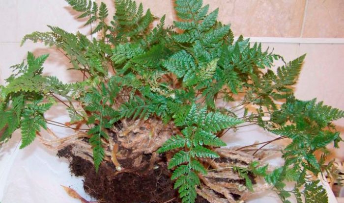 Даний папороть відрізняється від інших тим, що у нього є товсті повзучі коричневі коріння, на поверхні яких знаходиться сріблястий пушок. Вони ростуть по напряму вгору і незабаром починають звисати через край горщика. Довжина таких корінців може становити 90 сантиметрів. Завдяки такій особливості рослину ще називають «кролячі лапки» або «білячі лапки». Ці корені не можна зрізати.