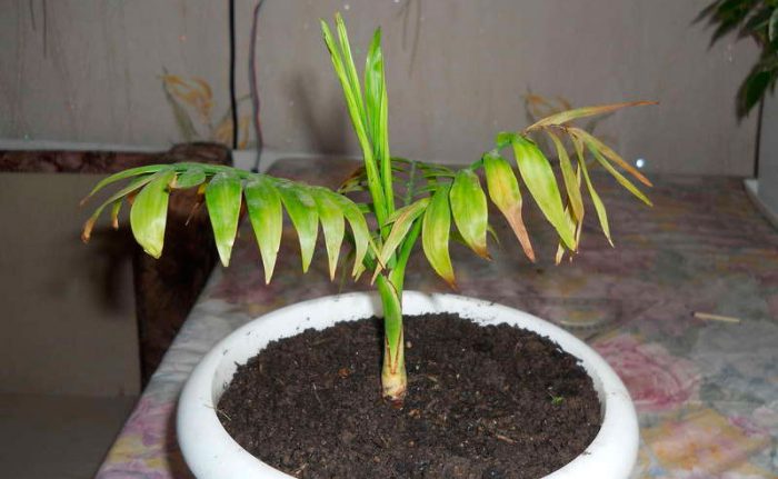 - На листочках з'явилися коричневі плями. Швидше за все, рослина зазнало різких коливань температур. Ван потрібно прибрати рослина подалі від протягів. Під час видалення пилу з пальми не можна застосовувати чистячі засоби.