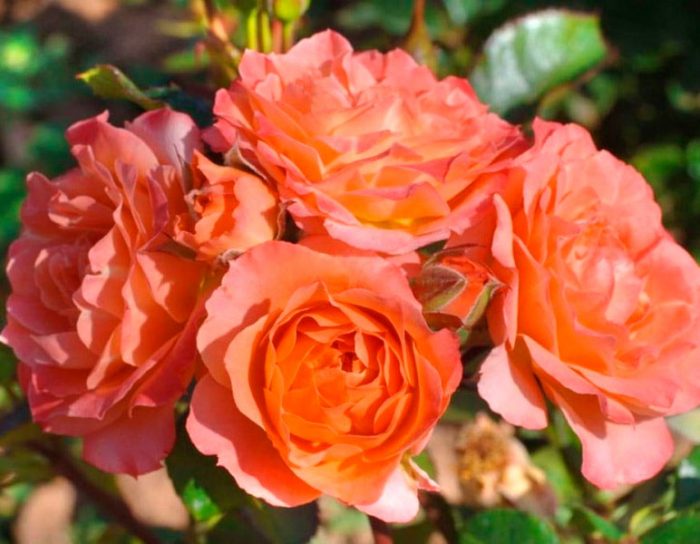 Існує дві троянди, які були виведені на відомій фірмі Мейланда. Перша з'явилася в 1958 році, а друга – на два десятки років пізніше. Неширокі і досить густі кущі висотою близько 35 сантиметрів утворені злегка відхиленими і трохи розгалуженими пагонами з щільними блискучими листочками, забарвленими в темний зелений відтінок. Середнього розміру (від 4 до 5 см) махрові квітки складаються з 25 пелюсток і мають приємний ніжний чайний аромат. Забарвлення квіток може варіюватися від жовтувато-оранжевого до інтенсивно абрикосового з жовтим відтінком. Троянди розташовуються в суцвіттях, які перебувають від 3 до 5 штук. Пишне цвітіння повторюється кілька разів.