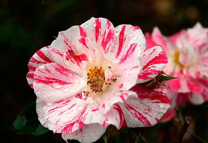 Виведений в 1975 році в США відомим селекціонером Ральфом Муром. Це перший сорт з смужками на пелюстках, який згодом став батьком багатьох смугастих троянд. Ефектні вузькі кущі висотою від 40 до 50 см складаються з розгалужених прямих пагонів майже без шипів. Красиві листя пофарбовані у світлий зелений відтінок. Махрові білі квітки мають велику кількість малинових смужок різної ширини. Вони розташовуються в суцвіттях по 3-5 штук. Цвітіння триває практично безперервно.