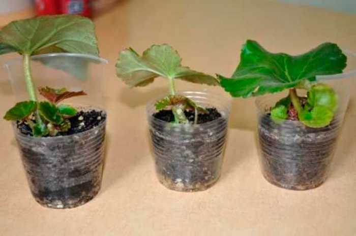 Дуже цікавий варіант розмноження бегонії частинками листя, розрізаних на маленькі трикутники. При цьому потрібно стежити, щоб у вершині кожного трикутника перебувала жилка. Після цього, вирізані трикутнички, щільно притискаються до землі і накриваються плівкою. Плівку треба щодня піднімати для провітрювання, а вже через місяць можна буде побачити, як на обрізаних частинах листочків, з'являються нові пагони. Після цього потрібно дочекатися, щоб вони зміцніли й пересадити для подальшого зростання.