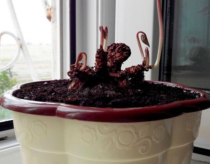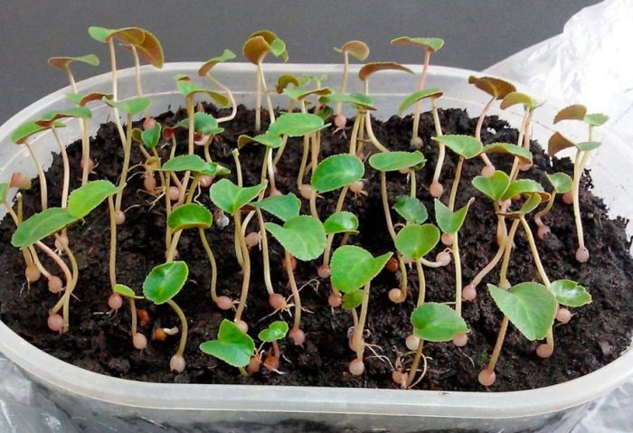 Перші сходи повинні здатися через 1-1,5 місяця. Як тільки це відбудеться, укриття прибирають в більш прохолодне місце (від 15 до 17 градусів), яке повинно бути добре освітлено, але при цьому захищене від прямих сонячних променів. Коли здадуться невеликі бульби і 2 або 3 листові пластини, проводять пікірування сіянців в горщики, наповнені почвосмесью, що складається з торфу, піску і листової ґрунту (2:1:4). Під час пересадки бульби слід повністю присипати почвосмесью. Через 7 днів після пересадки рекомендується підгодувати молоденькі кущики, для цього використовують квіткове добриво, розбавлене вдвічі. В останні весняні тижні проводять пересадку сіянців в індивідуальні ємності, а перше їх цвітіння має настати приблизно на десятому місяці зростання.