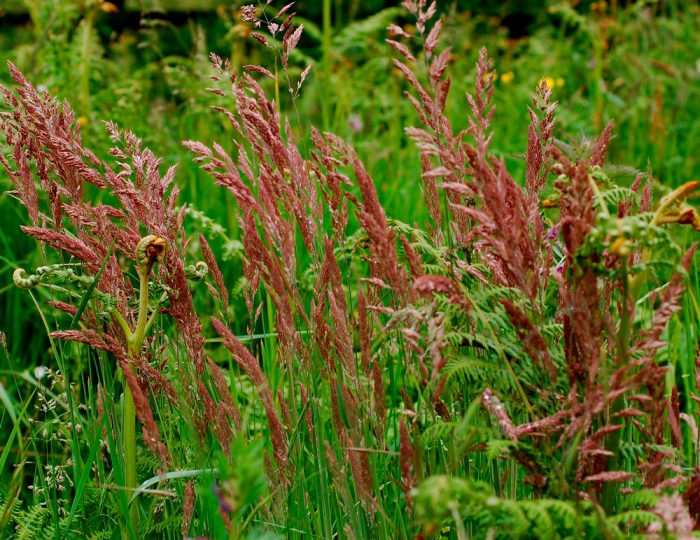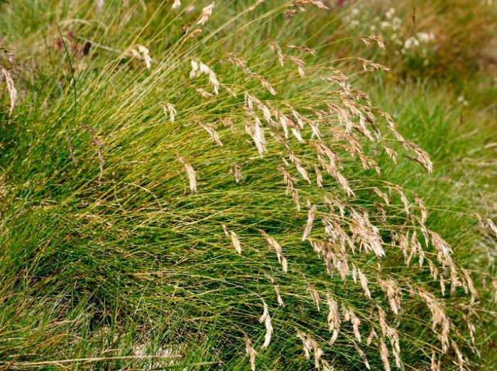 До складу дернини входять пагони голі, висота яких варіюється від 60 до 80 мм. А також є бічні блідо-червоні відростки, що відрізняються високою щільністю. На поверхні виростків розташована густі тонкі листи, довжина яких від 0,3 до 0,4 м. Червонувато-зелені листові пластини складені повдоль серединної жилки, причому поверхня у них ребриста. Квітучий кущ прикрашають нещільні волоті, мають довжину приблизно 12 сантиметрів. Це зимостійка рослина краще всього росте на вологому або затопленому грунті.