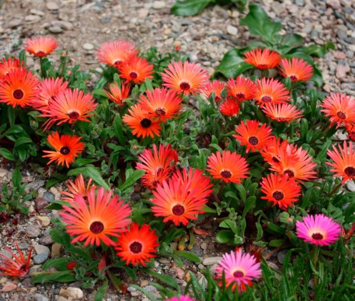Лежачі стебла даного виду прикрашені вузькими м'ясистими листовими пластинами. Забарвлені квітки можуть бути в червоний, оранжевий, рожевий або жовтий відтінок.