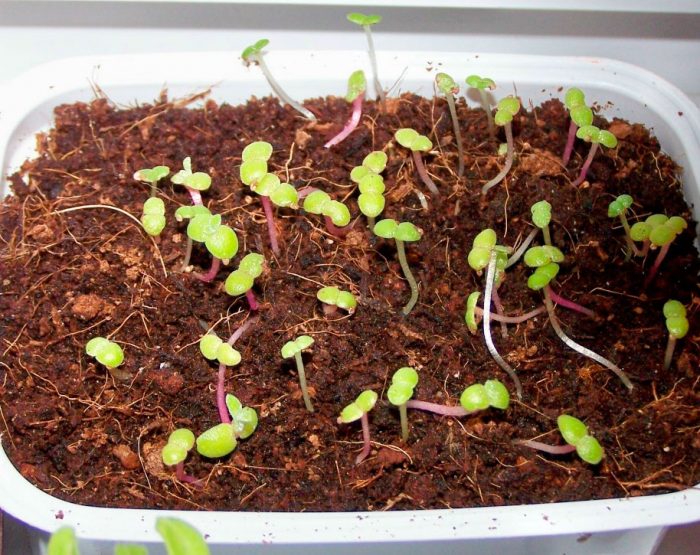 Вирівняйте поверхню субстрату і рівномірно розподіліть по ній насіння. Заглиблювати їх у ґрунт або присипати зверху не потрібно. Зволожте посіви з пульверизатора та ящик зверху накрийте плівкою або склом. Перші сіянці повинні будуть здатися через 10-12 діб.