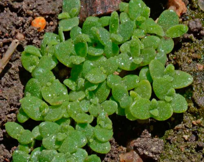 Мичкувата система коренів заглиблена в ґрунт на 20-25 сантиметрів. Висота куща може варіюватися від 5 до 30 сантиметрів. Його сланкі стебла досить м'ясисті. Листя і стебла пофарбовані в темно-зелений або смарагдовий відтінок. Розміщені дуже близько один до одного пагони формують щільний килим, переплітаючись між собою. Сидячі листові пластини мають овальною формою, їх товщина від 20 до 30 міліметрів. Після поливу або дощу товщина листя може збільшуватися, так як у них накопичується волога.