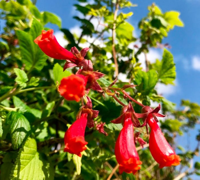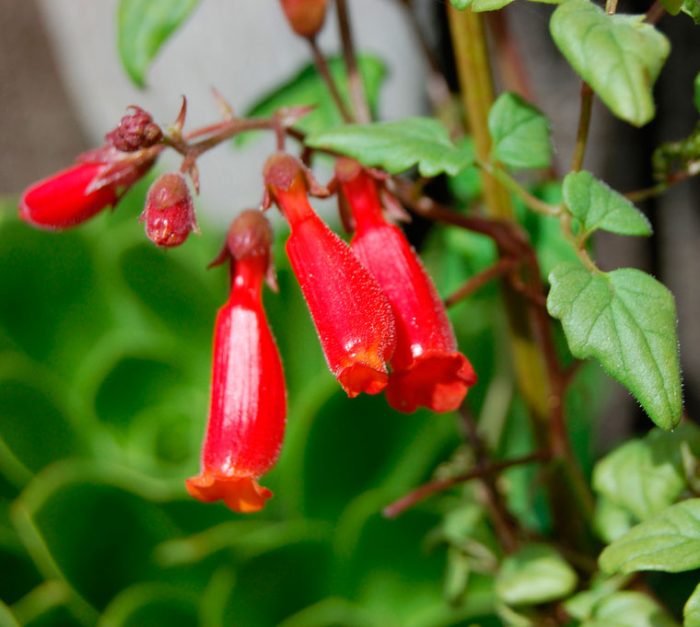 Крім ефектної і не зовсім звичайної листя ця ліана виділяється дуже красивими квітками, яких утворюється величезна кількість. Під час цвітіння на верхівках гілок формуються нещільні гроновидні суцвіття, до складу яких входять трубчасті маленькі квітки. Вони мають вогненним забарвленням. Квітки супротивнорасположенны щодо листя, саме тому вони чітко виділяються на їх фоні. Зів у них практично закритий, а трубка ― вузенька. Здалеку може здатися, що квіти ― це бризки яскравої фарби на зеленому тлі. Коли рослина відцвітає, то на місці квіток формуються блідо-зелені плоди, формою схожі більше на невеликі перчики або списа. Початок їх дозрівання припадає на серпень. Пам'ятайте, що формуються на місці суцвіть плоди негативно позначаються на пишноти цвітіння.