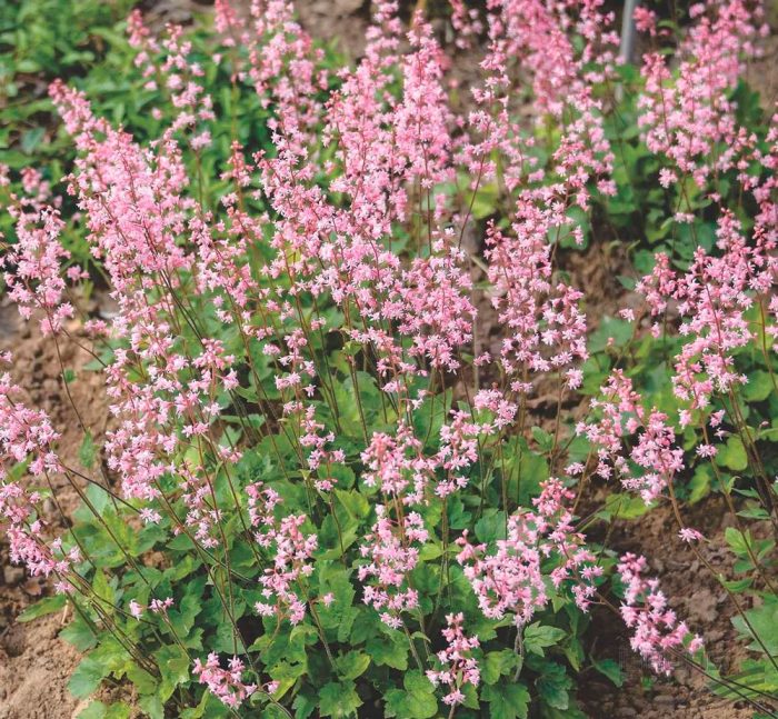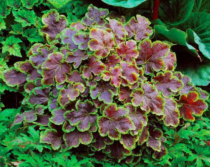 У гейхереллы є безліч сортів, що відрізняються один від одного забарвленням і величиною листя. Є сорти, листя яких забарвлена в червоний, зелений, фіолетовий і інші відтінки. Суцвіття витягнутої форми складаються з маленьких дзвоникоподібних квіток. Найбільшою популярністю користуються наступні сорти: