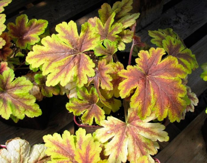 Серединка у великих листових пластин коричнево-червона, а кромка ― персикового відтінку. Блідо-коричневі жилки розсікають листя на декілька часток.