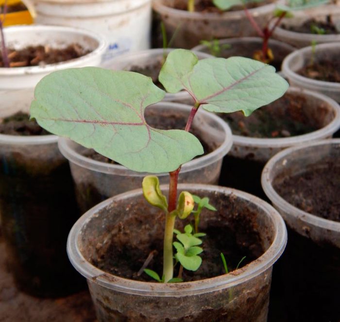 Для початку наповніть невеликі стаканчики субстратом, що складається з піску, листового дерну і торфу. В кожну ємність висівається по одній насінині, причому його треба загортати в ґрунт на глибину близько 40 мм. Посіви акуратно зволожують з пульверизатора, а зверху їх накривають плівкою і переносять у тепле місце з розсіяним світлом. Для того щоб сіянці з'явилися як можна швидше, не забувайте регулярно провітрювати і зволожувати посіви з пульверизатора, а також стежте за тим, щоб вони знаходилися в теплі (близько 23 градусів).