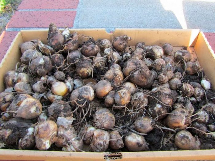 Постарайтеся викопати кущі до того, як їх листя відімре і відпаде, оскільки в цьому випадку дуже складно знайти точне місце знаходження цибулинок. Для вилучення кущів із землі використовують лопату, так як цибулини розташовані досить глибоко. Витягнутим луковичкам потрібно промивання під струменем води і півгодинне протравление в розчині Карбофосу (3-4%), замість цього їх можна 10 хв. витримати в дуже теплій воді (близько 50 градусів). Після цього їх укладають в затінене добре вентильоване приміщення для просушування на 7 днів, температура повітря повинна бути близько 20 градусів.