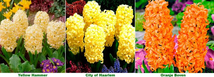 - City of Haarlem. Позднецветущий сорт має тривалість цвітіння від 15 до 17 доби, довжина квітконосу ― від 25 до 27 сантиметрів. Жовтуваті квітки в кінці цвітіння стають блідо-кремовими.