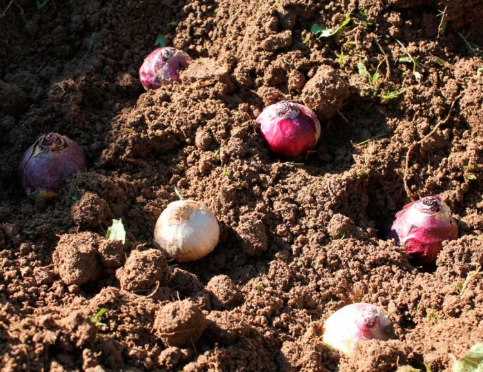 Для початку огляньте посадковий матеріал і приберіть всі хворі, м'які або травмовані цибулинки. Потім їх перед самою висадкою в грунт занурюють у розчин фунгіцидної препарату на 30 хвилин. Цибулинки, в діаметрі досягають приблизно 50 мм, висаджують на глибину від донця від 15 до 18 сантиметрів, ширина міжрядь повинна бути близько 20 сантиметрів, а дистанція між цибулинами ― 15 сантиметрів. Цибулинки меншого розміру, а також дітки висаджують на меншу глибину, при цьому відстань між ними теж треба скоротити.