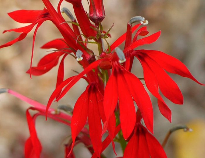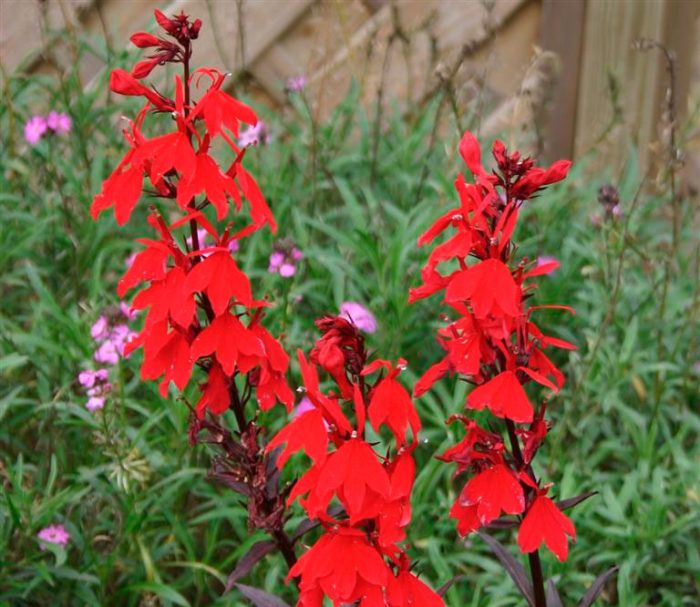 Або лобелія вогняна. В залежності від сорту кущ заввишки близько 0,75 м можуть прикрашати листові пластини червоного або зеленого кольору. Самий популярний сорт такого виду ― Королева Вікторія: кущ у висоту досягає до півтора метрів, а його прикрашають квітки яскраво-червоного забарвлення.