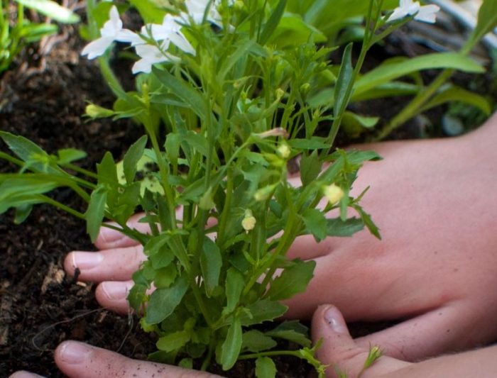 Як правило, у відкритий грунт підрослу розсаду лобелії пересаджують з середини до кінця травня після того, як загроза поворотних заморозків залишиться позаду. Відповідний ділянка має бути добре освітленим, при цьому грунт необхідний пухкий, не дуже поживний суглинистий або супіщаний. Готуючи грунт до висадки розсади, в неї не можна вносити занадто велику кількість азоту, інакше кущики зростуть пишними, але цвісти вони дуже бідно. В одну посадочну лунку треба висадити всі сіянці, що знаходяться в одному стаканчику (3 або 4 штуки). При підготовці лунок дотримуйтесь між ними дистанцію в 10-15 сантиметрів.