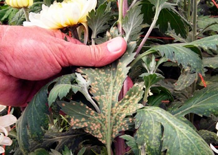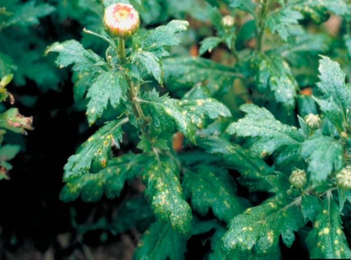 - Іржа. У ураженої хризантеми на всіх надземних частинах утворюються хлоротичні плями, через деякий час вони стають бурими, а також спостерігається пожовтіння листя і проріджування пагонів.