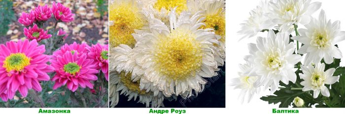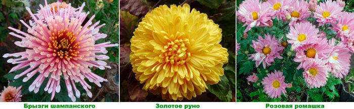 - Бризки шампанського. Ця хризантема кущова у висоту досягає від 0,7 до 0,9 м. Рожеве голчата суцвіття, в поперечнику досягає 80-100 мм, в серединці має блідо-жовте напилення, існують сорти з квітками золотистого забарвлення. Цвітіння починається в жовтні і триває до сильних морозів. Добре зимує в саду.