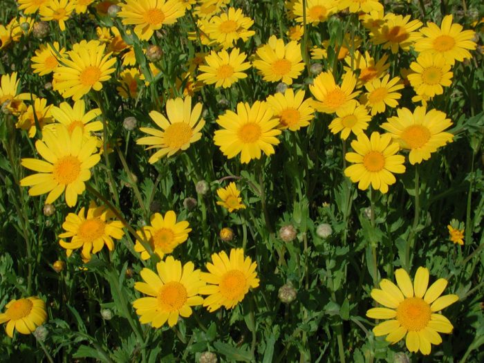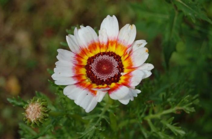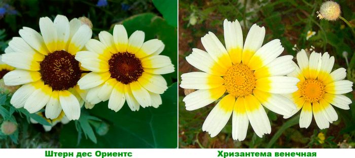 - Хризантема вінцева. Висота стебел варіюється від 0,4 до 1 метра, вони густо вкриті перисто-роздільними листовими пластинами, також на кущі є ланцетоподібні, зубчасті листя. У діаметрі суцвіття досягають близько 30 мм, язичкові квіточки можуть бути пофарбовані в різні відтінки від білого до жовтого, а трубчасті―зеленувато-жовті.