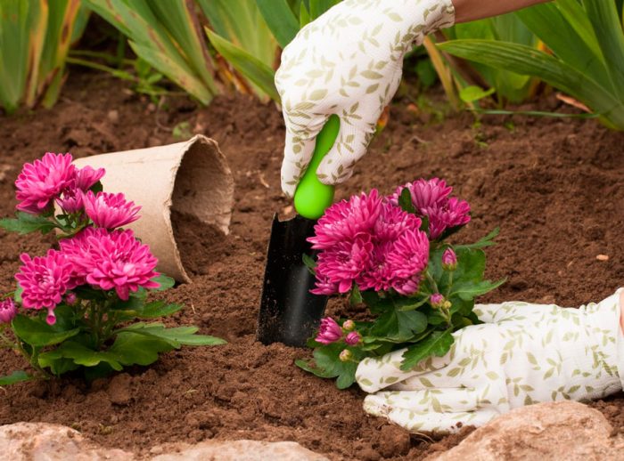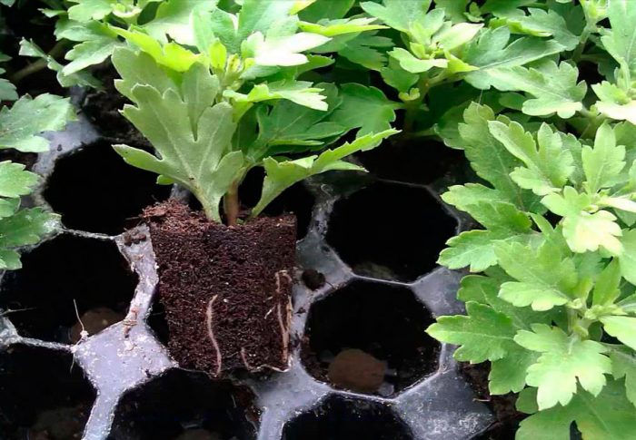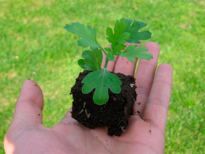 Висадку розсади хризантеми в сад рекомендується проводити в дощовий або хмарний день. Висаджувати кущики зручніше в траншею, а не в посадкові ямки, при цьому між ними треба залишати відстань від 0,3 до 0,5 м (в залежності від виду і сорту). Для того щоб висаджені сіянці швидше вкоренилися, їх проливають розчином Корневін (на 1 л води 1 грам). Коли рослинки будуть висаджені і политі, їх прищипують, для цього прибирають точку росту. Потім розсаду рекомендується накрити будь-яким покривним матеріалом, наприклад, лутрасілом. Це дозволить створити сприятливий мікроклімат, який необхідний сіянцям для нормального вкорінення і росту. Після того як хризантема приживеться і рушить в зростання, укриття прибирають.