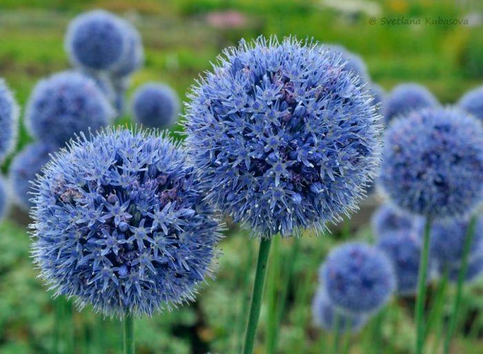 Даний вид відноситься до числа найбільш декоративних видів аллиума. Стебла такого рослин у висоту може досягати близько 0,8 м. У діаметрі суцвіття сягає близько 70 мм, воно являє собою пишний парасольку напівкуляста або кулястої форми. До складу одного суцвіття входить від 200 до 250 барвистих квіток блакитного забарвлення колокольчатовидной форми. Забарвлення суцвіття неймовірно ефектний, може навіть здатися, що на планеті Земля просто неможливо відшукати щось більш красивого блакитного забарвлення.