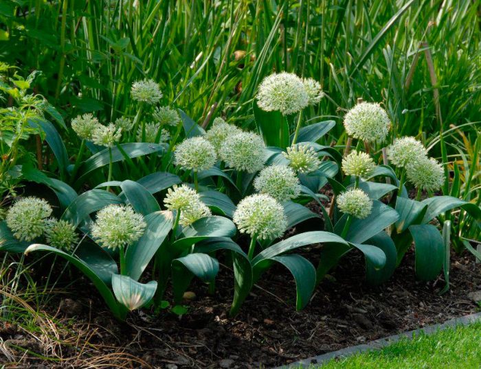 Цей вид є раннецветущим і цвіте він у травні та червні. Довгі квітконоси у висоту досягають від 0,3 до 0,4 метрів, на їх верхівках формуються ефектні суцвіття, представлені пишними кулями, до складу яких входять невеликі квіточки снежнобелого забарвлення, в діаметрі досягають 40 мм і володіють приємним запахом. Тривалість цвітіння становить від 15 до 20 днів. Якщо потерти пагони або листя, то можна відчути запах часнику.