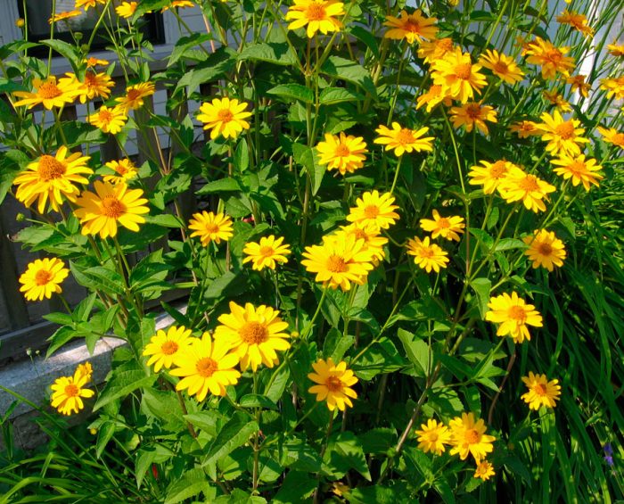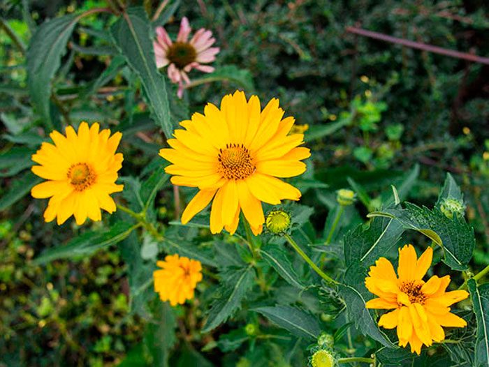 Або гелиопсис подсолнечниковидный ― пагони у такого багаторічного рослини голі прямі й гіллясті, заввишки вони досягають близько 100 див. Зубчасті по краю листові пластини до вершини загострюються. Забарвлення суцвіть-кошиків золотисто-жовтий.
