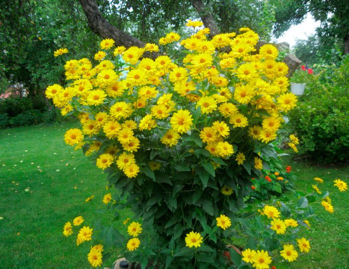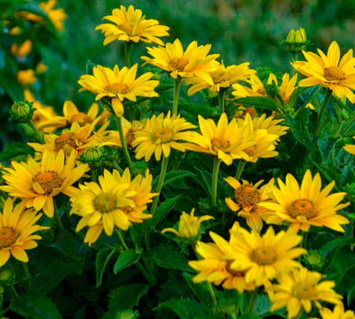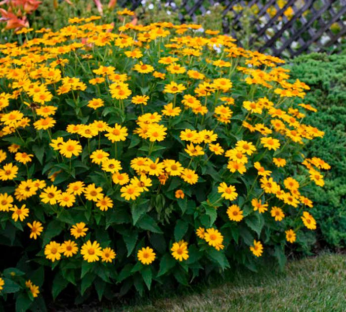 - Зонненглют. Висота кущика з блискучими темно-зеленими листовими пластинами близько 1,2 м. Кошики оранжево-жовті.
