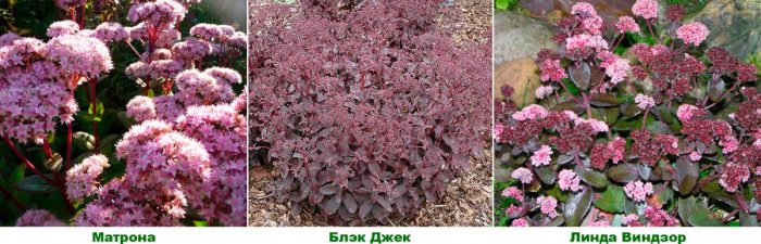 - Матрона. Висота потужного куща близько 0,6 м. На темно-пурпурових пагонах виростають великі зеленувато-сині листові пластини, з часом їх кромка забарвлюється в червоний колір. Квітки забарвлені в рожевий колір.