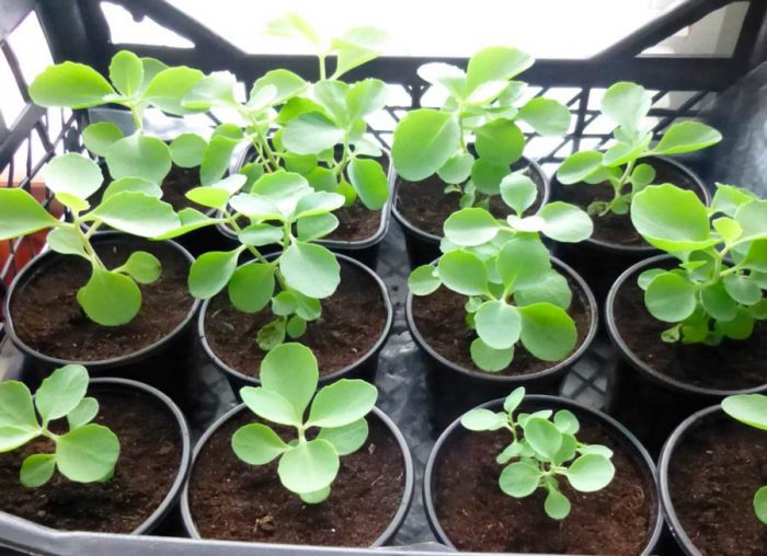 Сіянці такого рослини дуже маленькі. Після того як поява сходів буде масовим, укриття з ємності прибирають. Пікіровку рослинок в індивідуальні маленькі горщики проводять під час формування у них другою цієї листової пластини. Доглядати за розсадою дуже просто, для цього її треба систематично поливати і легенько спушувати поверхню ґрунтосуміші. Коли до пересадки у відкритий грунт залишиться 7 днів, її починають загартовувати, для цього рослини кожен день переносять на вулицю, при цьому тривалість такої процедури треба збільшувати поступово.