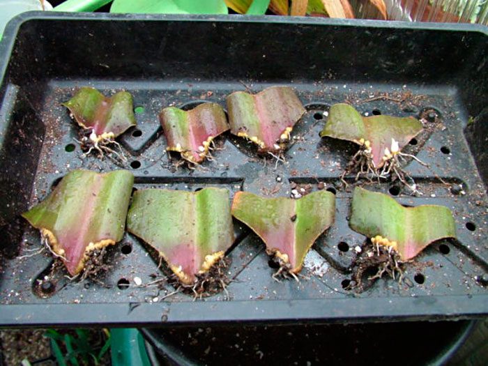 Розмноження такої квітки можна зробити листовими живцями. Для цього у кущика необхідно відірвати листову пластину безпосередньо біля її основи, після чого лист гострим предметом поділяють на частини, довжина яких повинна варіюватися від 40 до 60 мм, при цьому слід намітити нижню або верхню їх частину. Потім відрізки заглиблюють нижньою частиною в грунтосуміш, що складається з торфу і піску, на глибину 25 мм. Потім листові живці потрібно зверху накрити прозорим ковпаком і забезпечити їм температуру близько 20 градусів. Провітрювати живці необхідно 1 раз у 7 днів, це на деякий час прибираючи укриття. Через 2-2,5 місяці по крайці частин листових пластин повинні утворитися невеликі цибулини. Їх слід акуратно відірвати і висадити в субстрат, де вони повинні дорости до необхідної величини.