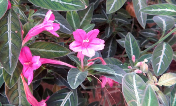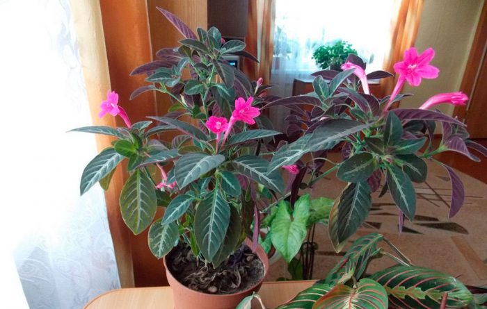 Трубчасті квіточки цієї рослини пофарбовані в білий або рожево-червоний колір. Вони дуже схожі з квіточками деяких рослин, що відносяться до сімейства геснерієвих, однак ці квіти не перебувають у родинних стосунках. Квіточки розташовуються в листових пазухах верхньої частини пагонів. Розпустилися квітки тримаються на рослині не довго. Так, вони розпускаються в ранкові години, а після обіду вже опадає. На наступний день з'являються нові квіточки. Цвітіння досить тривалий (з серпня по грудень) і знаходиться в прямій залежності від освітлення (при хорошому освітленні цвітіння більш рясне).