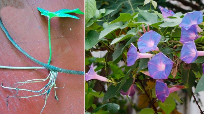 Є види цієї ліани, для розмноження яких використовують черешки. Наприклад, у такий спосіб розмножують ипомею батат. Обріжте кілька стебел іпомеї і наріжте з них живці, при цьому врахуйте, що в них має бути 2 міжвузля, а в довжину вони повинні сягати від 15 до 20 сантиметрів. Нижній зріз у черешка потрібно робити під кутом в 45 градусів на 1,5 см нижче вузла. З нижньої частини живців потрібно обірвати всі листові пластини, після цього їх треба поставити у воду. Корінці мають зрости вже на 3-5 добу, після цього живці рекомендується відразу ж висаджувати в грунт. Ліану ростять в теплі (від 20 до 25 градусів). В субстраті іпомея повністю вкорінюється протягом 7 днів. Приблизні строки укорінення живців: