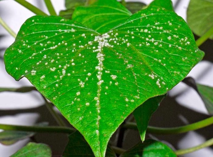 Найбільшу небезпеку для іпомеї представляють такі шкідливі комахи, як попелиці і павутинний кліщ. Якщо шкідників мало, то можна постаратися усунути їх щадними методами. Щоб винищити тлю, кущик обприскують мильною водою, при цьому від павутинного кліща можна позбутися за допомогою холодної води. Якщо ж комах дуже багато, то кущик треба буде обов'язково обприскати системним інсектицидом, наприклад: Карбофосом, Актелліком, Акарином або Фитовермом.