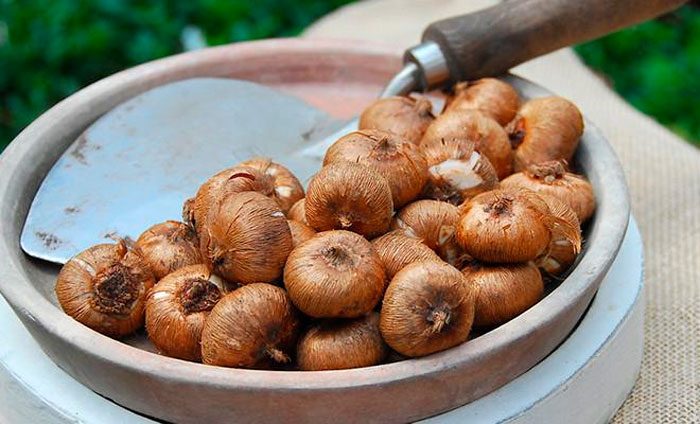 У який час краще викопати цибулини? Після того, як рослина відцвіте, його квітконоси потрібно видалити, однак нижні листові пластини повинні залишитися на кущику до перших заморозків. Після того, як на вулиці встановиться холодна погода, надземну частину квітки потрібно відрізати, а витягнуті з грунту клубнелуковички, прибирають на зберігання.