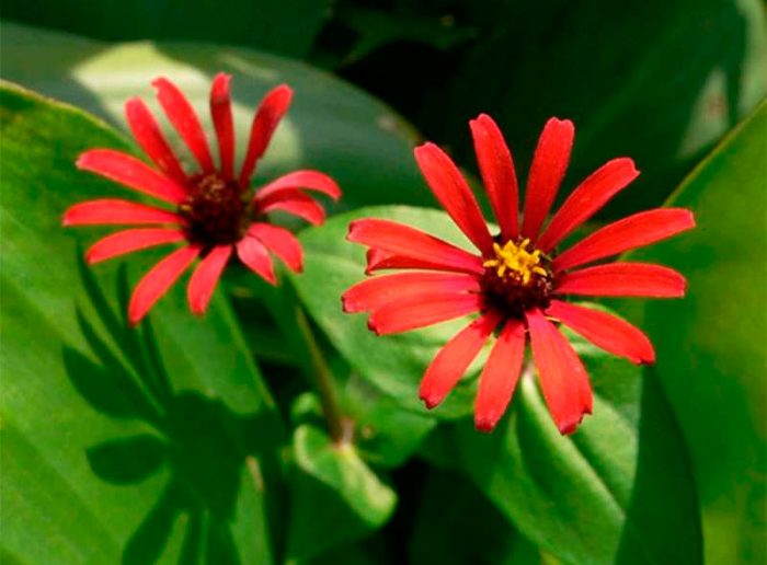 - Цинія скабиозоцветная (анемоноцветная). У діаметрі суцвіття досягають 80 мм. Язичкові квітки розміщуються в 1 ряд навколо серединки, яка складається з трубчастих квіток розрослися віночками, з-за чого серединка зовні схожа з півкулею. Серединка пофарбована в тон язичковим квіточкам.