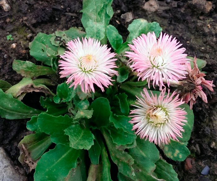 Висота кущиків 0,1–0,3 м. Прикоренева розетка складається з листових пластин лопатчатой або довгасто-яйцевидної форми. На другий рік після появи сіянців у кущиків формується велика кількість безлистих квітконосів, на поверхні яких є опушення, при цьому у висоту вони досягають 0,15–0,3 м. Суцвіття кошики в діаметрі досягають 80 мм, вони можуть бути пофарбовані в рожевий, білий або червоний колір. По периферії кошиків розташовуються великі язичкові або трубчасті квіточки, при цьому в серединці знаходяться жовто-золотисті маленькі трубчасті квіточки. Насіння плоскі маленькі овальної форми. Даний вид прекрасно розмножується самосівом, дружні сходи, що з'явилися навесні, при бажанні можна використовувати в якості розсади.