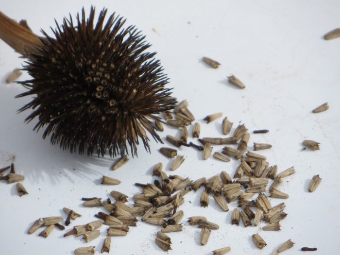 Вище вже говорилося про те, що видовий ехінацею садівники воліють розмножувати насінням. Насіння мають досить велику величину. Їх висів виробляють у весняний час безпосередньо у відкритий грунт, так як кращою температурою повітря для появи сіянців вважається 13 градусів. Висіяне насіння не заглиблюють, а присипають зверху тоненьким шаром грунту. Проте досвідчені садівники рекомендують вирощувати такі квіти розсадним способом, справа в тому, що з'явилися сіянці дуже ніжні і можуть загинути за нестійкої погоди, яка спостерігається у весняний час. Для посівів використовують контейнери або ящики. Насіння треба заглиблювати в субстрат всього на 5 мм, а зверху їх слід присипати тоненьким шаром грунту. Потім посіви поливають з пульверизатора. Появи сіянців доведеться чекати порівняно довго, іноді вони виростають лише через 6 тижнів після посіву. Підрослу і зміцнілу розсаду необхідно висадити на садову ділянку. Потім їх вчасно поливають, регулярно видаляють бур'янисту траву з ділянки і проводять розпушування поверхні грунту. Виросли з насіння ехінацеї зацвітають найчастіше на другий рік життя, а в перший рік у них лише відростає листова розетка, яка у висоту може досягати від 15 до 20 сантиметрів.